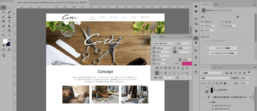 まずは美容室の雰囲気や内装、ターゲット層をヒアリングした上で、デザインツール上でカンプを作成。Jimdo特有の制約(レイアウト・フォント制限など)を考慮しながらも、店舗の温かみと居心地の良さを感じられるデザインを意識しました。